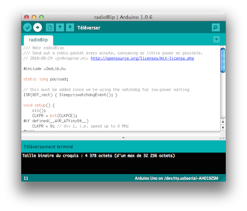Maintenant on va uploader le sketch. Branche ton JeeNode sélectionne le dans Outils > Port série (genre /dev/tty.usbserial-AH019ZSM).